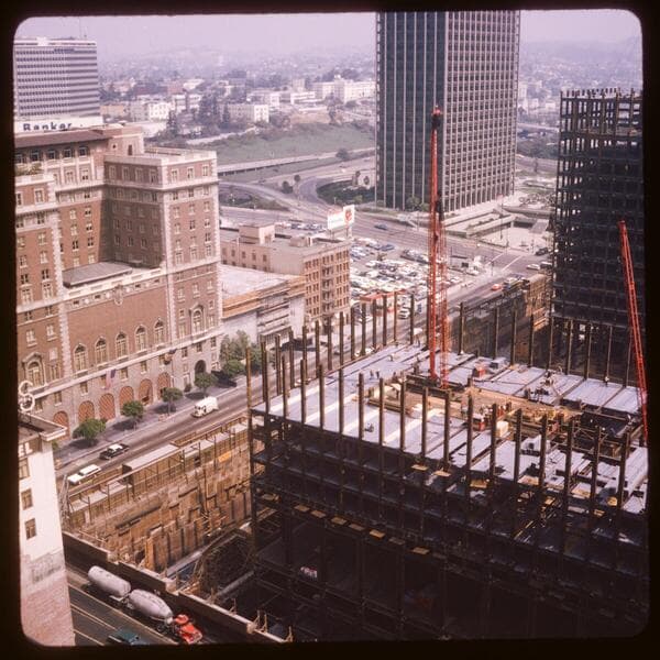 From 21st floor of Tishman Building at Flower Street and Wilshire Boulevard. Showing Bunker Hill redevelopment; Flower Street frontage also.