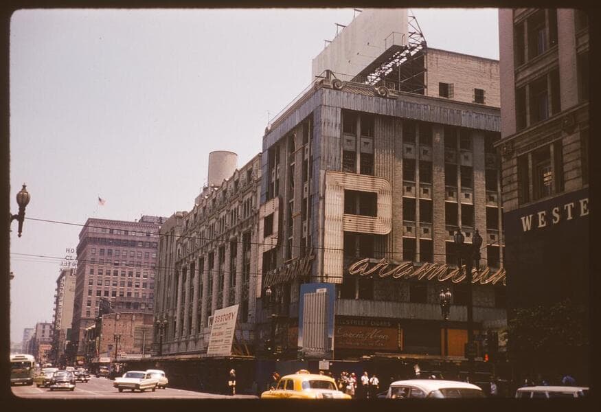 This collection consists of 35mm Kodachrome slides taken between 1954 and 1972. This collection of photographs taken by amateur photographer Palmer Conner documents by street the physical and social changes of Bunker Hill during the earliest stages of redevelopment. The collection is particularly strong in its depiction of the Bunker Hill neighborhood of downtown Los Angeles during redevelopment in the 1950s. Images chiefly consist of views of commercial and residential building exteriors taken from the street, including images of both new construction and older buildings in the process of being demolished.