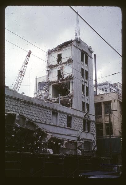 This collection consists of 35mm Kodachrome slides taken between 1954 and 1972. This collection of photographs taken by amateur photographer Palmer Conner documents by street the physical and social changes of Bunker Hill during the earliest stages of redevelopment. The collection is particularly strong in its depiction of the Bunker Hill neighborhood of downtown Los Angeles during redevelopment in the 1950s. Images chiefly consist of views of commercial and residential building exteriors taken from the street, including images of both new construction and older buildings in the process of being demolished.