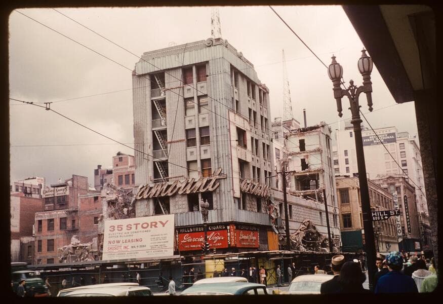 This collection consists of 35mm Kodachrome slides taken between 1954 and 1972. This collection of photographs taken by amateur photographer Palmer Conner documents by street the physical and social changes of Bunker Hill during the earliest stages of redevelopment. The collection is particularly strong in its depiction of the Bunker Hill neighborhood of downtown Los Angeles during redevelopment in the 1950s. Images chiefly consist of views of commercial and residential building exteriors taken from the street, including images of both new construction and older buildings in the process of being demolished.