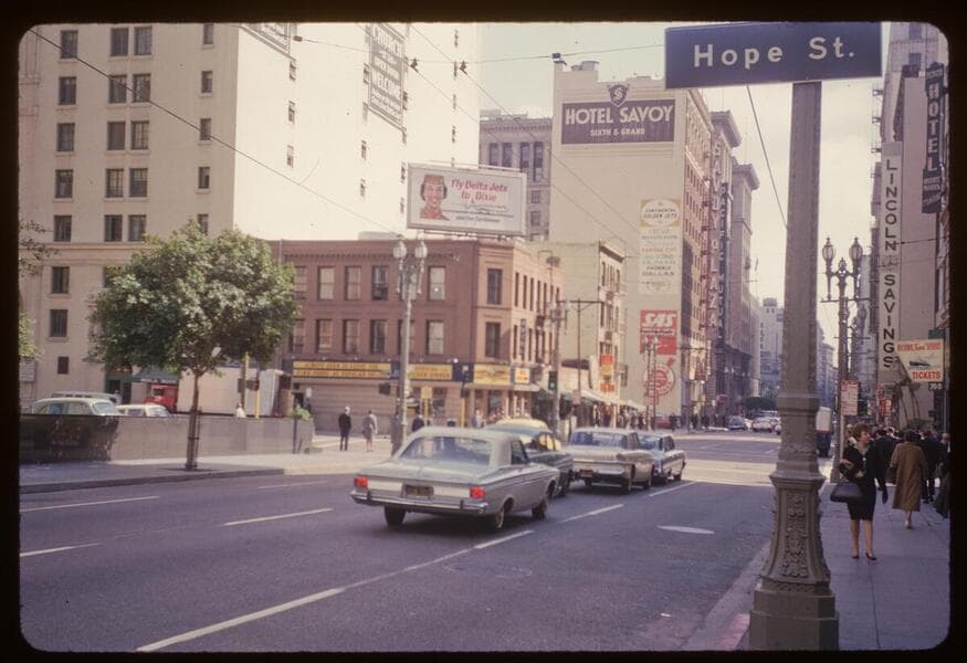 Eleven-story Savoy Plaza, 565 South Grand Avenue, on the northwest corner of Grand Avenue and 6th Street. To the right is the Mayflower Hotel, 535 South Grand Avenue. At far left, sign for National Oil Building, 609 South Grand Avenue.