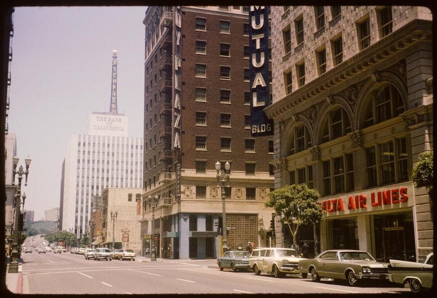 This collection consists of 35mm Kodachrome slides taken between 1954 and 1972. This collection of photographs taken by amateur photographer Palmer Conner documents by street the physical and social changes of Bunker Hill during the earliest stages of redevelopment. The collection is particularly strong in its depiction of the Bunker Hill neighborhood of downtown Los Angeles during redevelopment in the 1950s. Images chiefly consist of views of commercial and residential building exteriors taken from the street, including images of both new construction and older buildings in the process of being demolished.