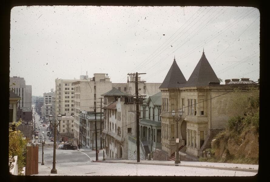 This collection consists of 35mm Kodachrome slides taken between 1954 and 1972. This collection of photographs taken by amateur photographer Palmer Conner documents by street the physical and social changes of Bunker Hill during the earliest stages of redevelopment. The collection is particularly strong in its depiction of the Bunker Hill neighborhood of downtown Los Angeles during redevelopment in the 1950s. Images chiefly consist of views of commercial and residential building exteriors taken from the street, including images of both new construction and older buildings in the process of being demolished.