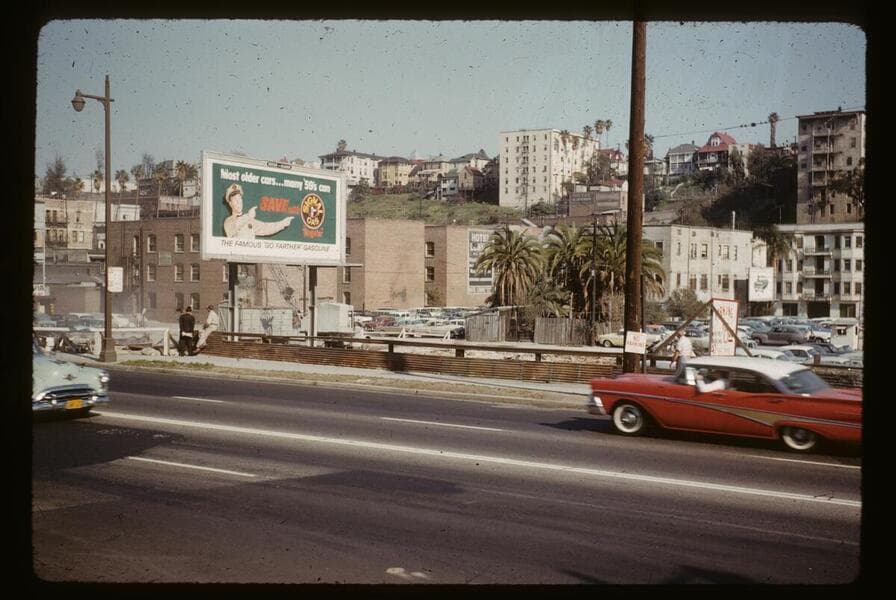 Second Empire style Victorian home with mansard roof and dormer windows. It occupied the south side of Temple Street at the north limit of Bunker Hill. Out front, 1954 Ford Mainline Tudor sedan.