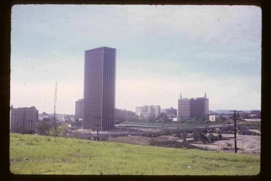 This collection consists of 35mm Kodachrome slides taken between 1954 and 1972. This collection of photographs taken by amateur photographer Palmer Conner documents by street the physical and social changes of Bunker Hill during the earliest stages of redevelopment. The collection is particularly strong in its depiction of the Bunker Hill neighborhood of downtown Los Angeles during redevelopment in the 1950s. Images chiefly consist of views of commercial and residential building exteriors taken from the street, including images of both new construction and older buildings in the process of being demolished.