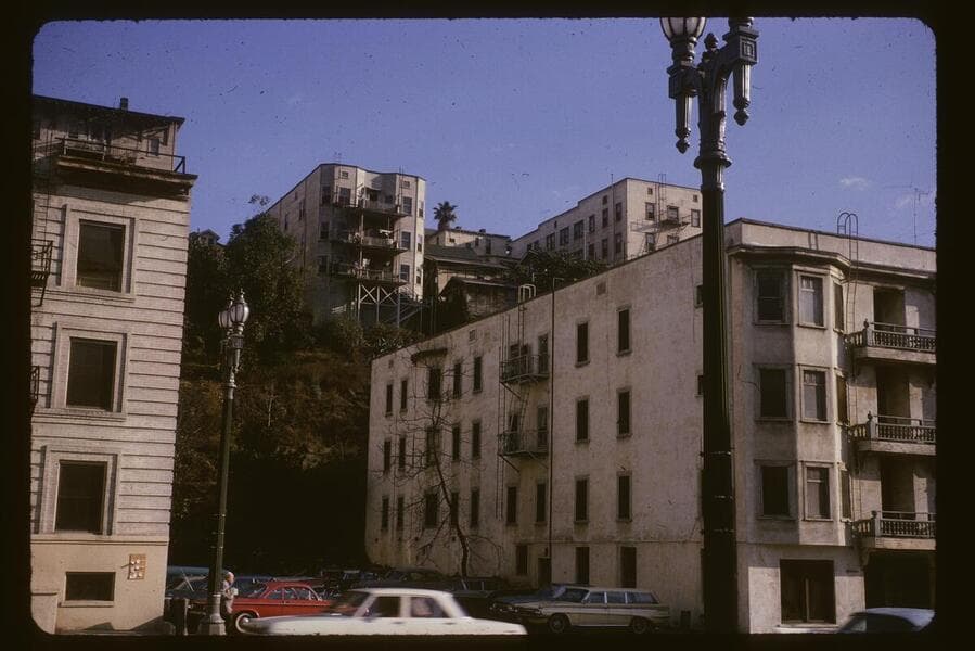 Apartments and hotels line Flower Street and Hope Street. Far left background, Hotel Elmar is at 325 South Hope Street. Its large rooftop sign reads, "NEW HOTEL ELMAR".