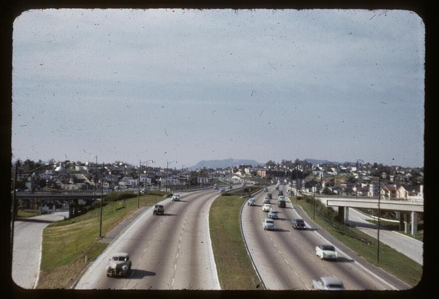 Image of automobiles on the Hollywood Freeway (Highway 101) from Bronson Avenue looking west in Hollywood, California, with the bell tower for the First Presbyterian Church of Hollywood at left and a sign for the Gower Street off-ramp on the right.