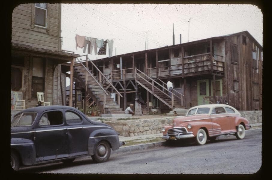 Gable roof, clapboard housing with front porches on Olive Street. 1949 Buick Super parked at right. City Hall visible.