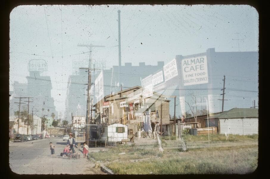 This collection consists of 35mm Kodachrome slides taken between 1954 and 1972. This collection of photographs taken by amateur photographer Palmer Conner documents by street the physical and social changes of Bunker Hill during the earliest stages of redevelopment. The collection is particularly strong in its depiction of the Bunker Hill neighborhood of downtown Los Angeles during redevelopment in the 1950s. Images chiefly consist of views of commercial and residential building exteriors taken from the street, including images of both new construction and older buildings in the process of being demolished.