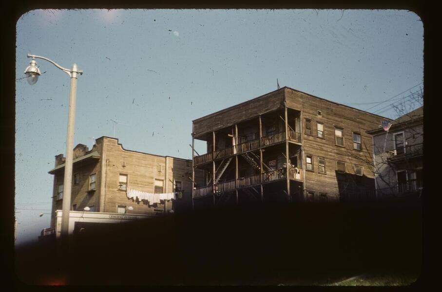 This collection consists of 35mm Kodachrome slides taken between 1954 and 1972. This collection of photographs taken by amateur photographer Palmer Conner documents by street the physical and social changes of Bunker Hill during the earliest stages of redevelopment. The collection is particularly strong in its depiction of the Bunker Hill neighborhood of downtown Los Angeles during redevelopment in the 1950s. Images chiefly consist of views of commercial and residential building exteriors taken from the street, including images of both new construction and older buildings in the process of being demolished.