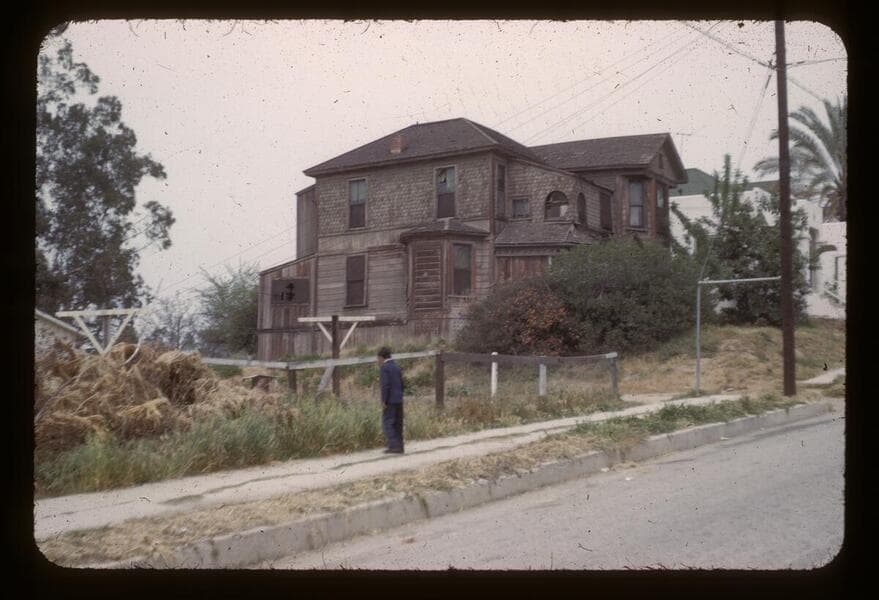 This collection consists of 35mm Kodachrome slides taken between 1954 and 1972. This collection of photographs taken by amateur photographer Palmer Conner documents by street the physical and social changes of Bunker Hill during the earliest stages of redevelopment. The collection is particularly strong in its depiction of the Bunker Hill neighborhood of downtown Los Angeles during redevelopment in the 1950s. Images chiefly consist of views of commercial and residential building exteriors taken from the street, including images of both new construction and older buildings in the process of being demolished.