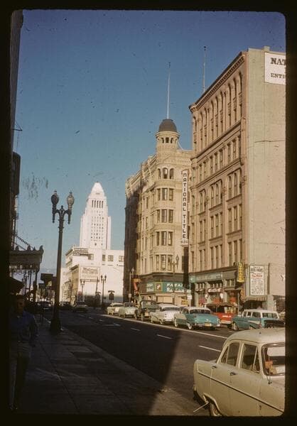 Spring Street south of 3rd Street with National Title Building, 126 West 3rd Street, at the corner on the left.