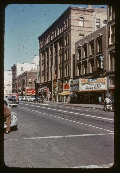 This collection consists of 35mm Kodachrome slides taken between 1954 and 1972. This collection of photographs taken by amateur photographer Palmer Conner documents by street the physical and social changes of Bunker Hill during the earliest stages of redevelopment. The collection is particularly strong in its depiction of the Bunker Hill neighborhood of downtown Los Angeles during redevelopment in the 1950s. Images chiefly consist of views of commercial and residential building exteriors taken from the street, including images of both new construction and older buildings in the process of being demolished.