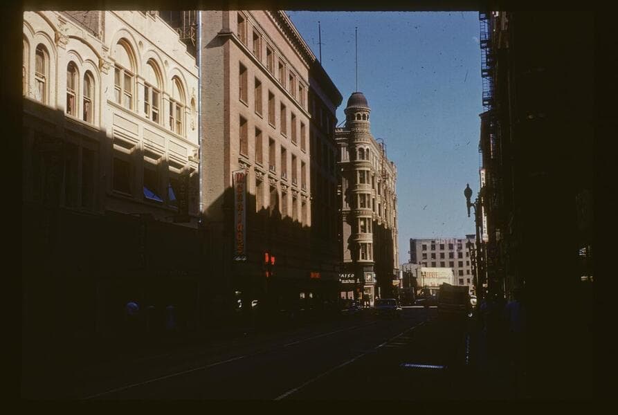 This collection consists of 35mm Kodachrome slides taken between 1954 and 1972. This collection of photographs taken by amateur photographer Palmer Conner documents by street the physical and social changes of Bunker Hill during the earliest stages of redevelopment. The collection is particularly strong in its depiction of the Bunker Hill neighborhood of downtown Los Angeles during redevelopment in the 1950s. Images chiefly consist of views of commercial and residential building exteriors taken from the street, including images of both new construction and older buildings in the process of being demolished.