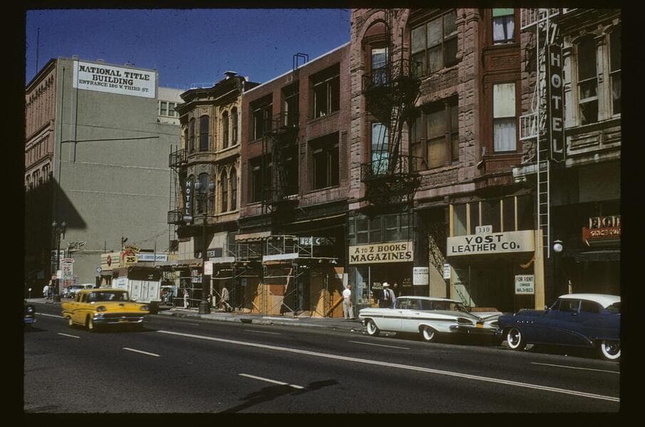This collection consists of 35mm Kodachrome slides taken between 1954 and 1972. This collection of photographs taken by amateur photographer Palmer Conner documents by street the physical and social changes of Bunker Hill during the earliest stages of redevelopment. The collection is particularly strong in its depiction of the Bunker Hill neighborhood of downtown Los Angeles during redevelopment in the 1950s. Images chiefly consist of views of commercial and residential building exteriors taken from the street, including images of both new construction and older buildings in the process of being demolished.
