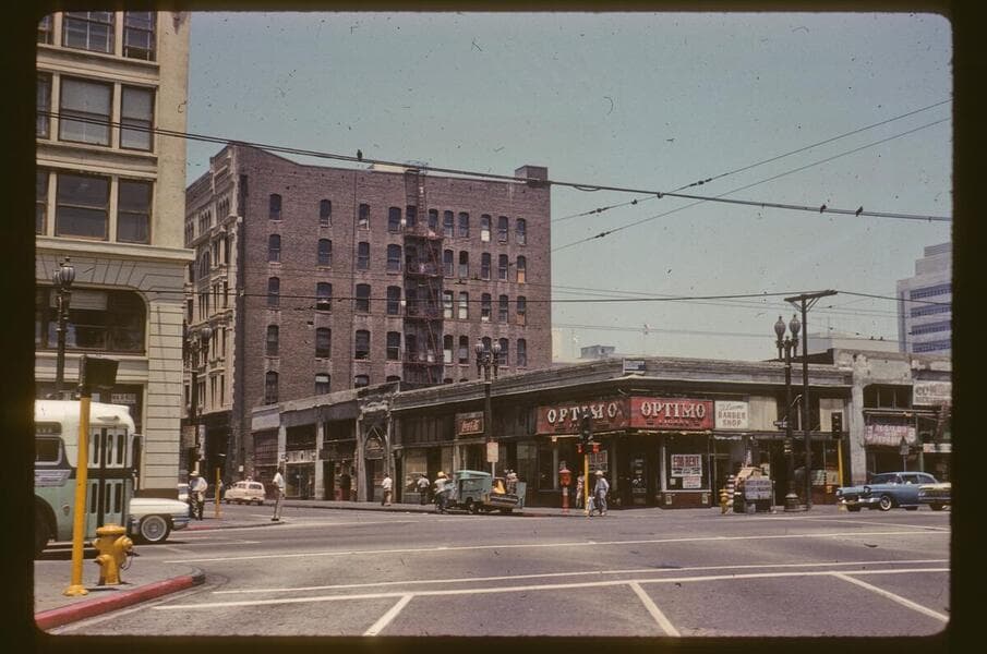 819-829 West 3rd Street. Middle of left building used to be the Lux Theater at 827 West 3rd Street. Union 76 station in far left background. Foreground street is Flower Street.