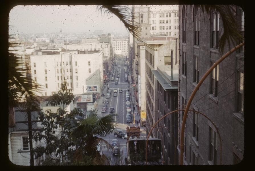 This collection consists of 35mm Kodachrome slides taken between 1954 and 1972. This collection of photographs taken by amateur photographer Palmer Conner documents by street the physical and social changes of Bunker Hill during the earliest stages of redevelopment. The collection is particularly strong in its depiction of the Bunker Hill neighborhood of downtown Los Angeles during redevelopment in the 1950s. Images chiefly consist of views of commercial and residential building exteriors taken from the street, including images of both new construction and older buildings in the process of being demolished.