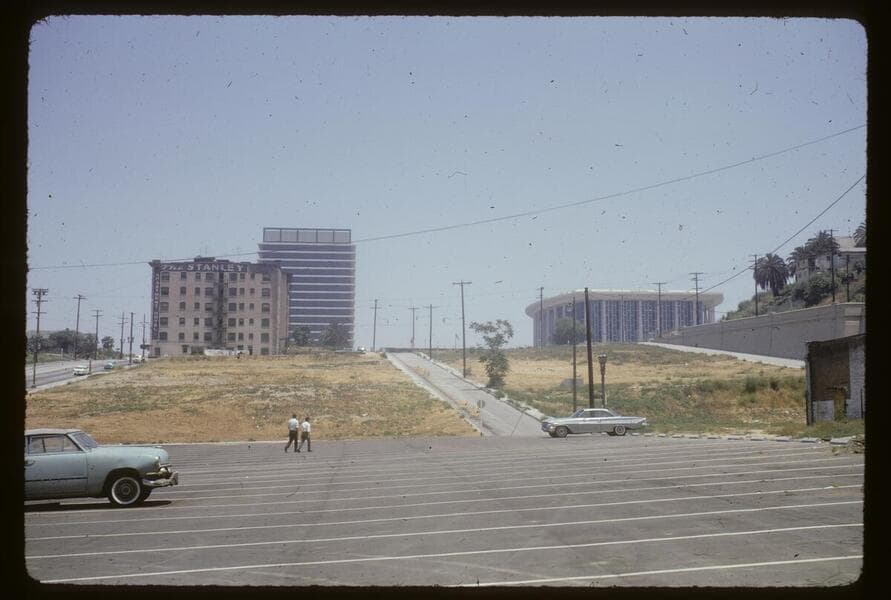 Entire square block bordered by 3rd to 4th Streets and Figueroa to Flower Streets has been cleared. Stanley Apartment Hotel, 210 South Flower Street, to the right.