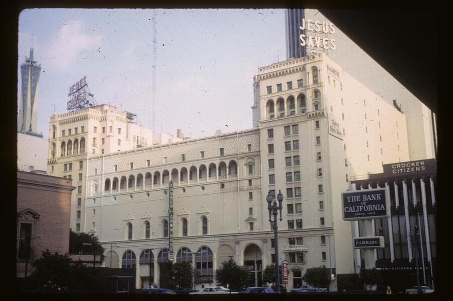 This collection consists of 35mm Kodachrome slides taken between 1954 and 1972. This collection of photographs taken by amateur photographer Palmer Conner documents by street the physical and social changes of Bunker Hill during the earliest stages of redevelopment. The collection is particularly strong in its depiction of the Bunker Hill neighborhood of downtown Los Angeles during redevelopment in the 1950s. Images chiefly consist of views of commercial and residential building exteriors taken from the street, including images of both new construction and older buildings in the process of being demolished.