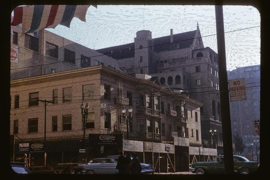 Entire north side block of 6th Street between Hope and Flower Streets to be demolished. Background building is the California Club, 538 South Flower Street.