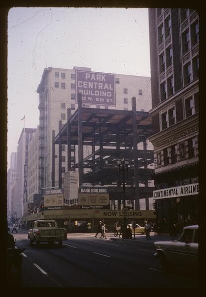 This collection consists of 35mm Kodachrome slides taken between 1954 and 1972. This collection of photographs taken by amateur photographer Palmer Conner documents by street the physical and social changes of Bunker Hill during the earliest stages of redevelopment. The collection is particularly strong in its depiction of the Bunker Hill neighborhood of downtown Los Angeles during redevelopment in the 1950s. Images chiefly consist of views of commercial and residential building exteriors taken from the street, including images of both new construction and older buildings in the process of being demolished.
