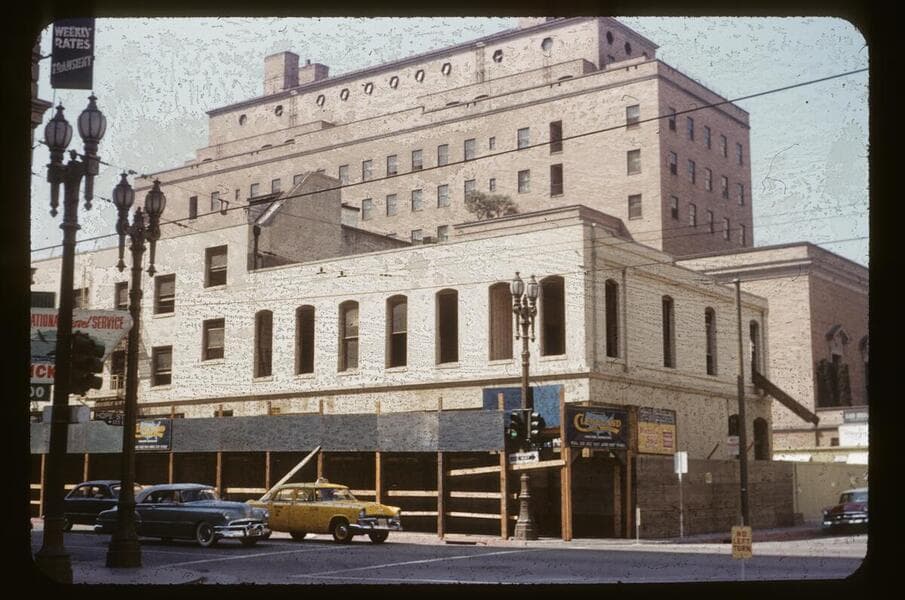 The Acacia Hotel, 708 West 6th Street, offered temporary apartments. Looking east on 6th Street toward the intersection of Hope Street. The 1947 General Petroleum Building is at the far right. The Acacia Hotel is at the southwest corner of 6th and Hope Streets.