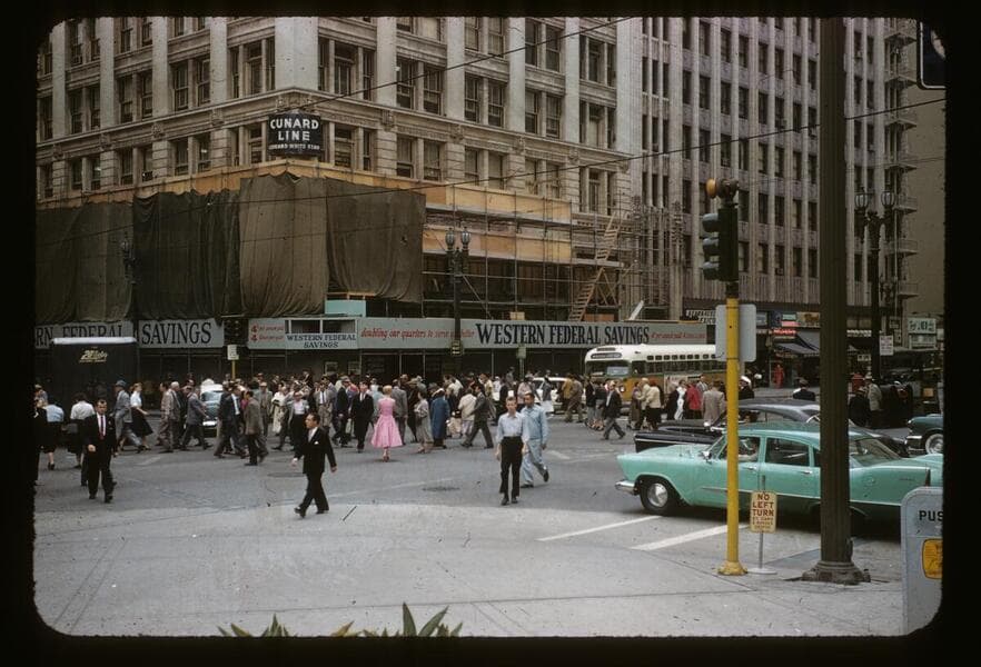 This collection consists of 35mm Kodachrome slides taken between 1954 and 1972. This collection of photographs taken by amateur photographer Palmer Conner documents by street the physical and social changes of Bunker Hill during the earliest stages of redevelopment. The collection is particularly strong in its depiction of the Bunker Hill neighborhood of downtown Los Angeles during redevelopment in the 1950s. Images chiefly consist of views of commercial and residential building exteriors taken from the street, including images of both new construction and older buildings in the process of being demolished.