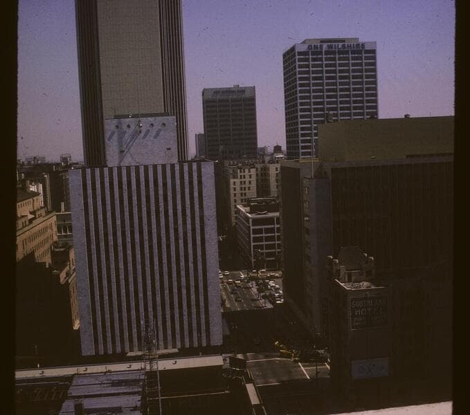 This collection consists of 35mm Kodachrome slides taken between 1954 and 1972. This collection of photographs taken by amateur photographer Palmer Conner documents by street the physical and social changes of Bunker Hill during the earliest stages of redevelopment. The collection is particularly strong in its depiction of the Bunker Hill neighborhood of downtown Los Angeles during redevelopment in the 1950s. Images chiefly consist of views of commercial and residential building exteriors taken from the street, including images of both new construction and older buildings in the process of being demolished.