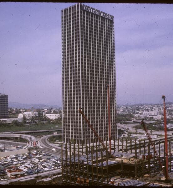 View of Union Oil Company of California, 1201 West 5th Street, from the 23rd floor of the Union Bank building. Thirteen story Home Office Building tower linked by two pedestrian bridges to the Beaudry Building with its auditorium and cafeteria across the street. The Union Oil center covers a square block.