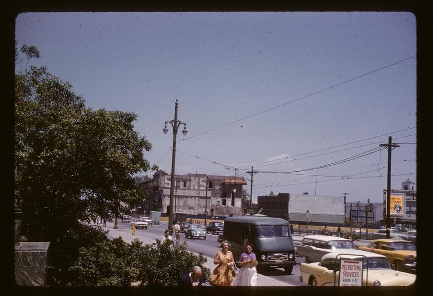 Part of the Brunswig Building, 501 North Main Street, at far left. Pico House, Merced Theater, and Masonic Hall under restoration.