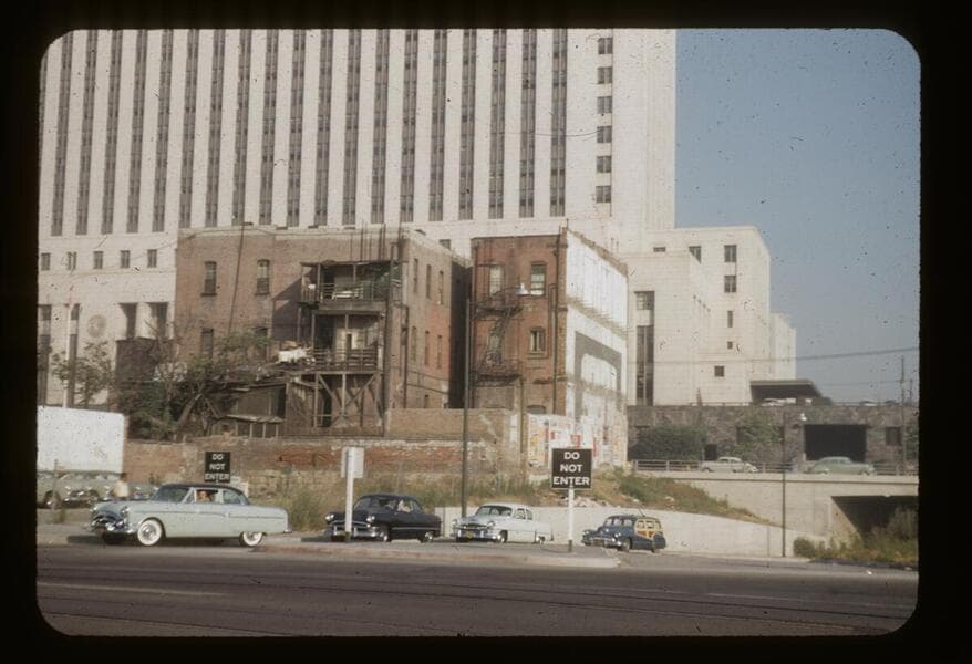 Rear view of Grand Central Hotel being demolished. Main Street at 101 Freeway