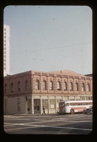 Southeast corner of the 1st Street and Broadway intersection. Bancroft-Whitney Company, publisher of law books, has a place on the 1st Street side. Ogee's restaurant at the corner with Mexico City Cafe to the right. Los Angeles Transit Lines' Line 6 bus going north on Broadway. 1949-50 Ford wagon leaving the intersection at left. Los Angeles Times building complex in surrounding background.