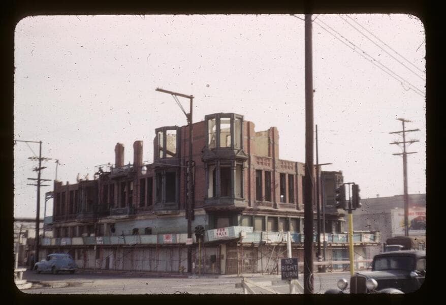 This collection consists of 35mm Kodachrome slides taken between 1954 and 1972. This collection of photographs taken by amateur photographer Palmer Conner documents by street the physical and social changes of Bunker Hill during the earliest stages of redevelopment. The collection is particularly strong in its depiction of the Bunker Hill neighborhood of downtown Los Angeles during redevelopment in the 1950s. Images chiefly consist of views of commercial and residential building exteriors taken from the street, including images of both new construction and older buildings in the process of being demolished.