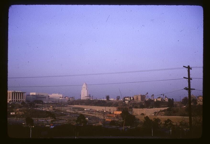 This collection consists of 35mm Kodachrome slides taken between 1954 and 1972. This collection of photographs taken by amateur photographer Palmer Conner documents by street the physical and social changes of Bunker Hill during the earliest stages of redevelopment. The collection is particularly strong in its depiction of the Bunker Hill neighborhood of downtown Los Angeles during redevelopment in the 1950s. Images chiefly consist of views of commercial and residential building exteriors taken from the street, including images of both new construction and older buildings in the process of being demolished.