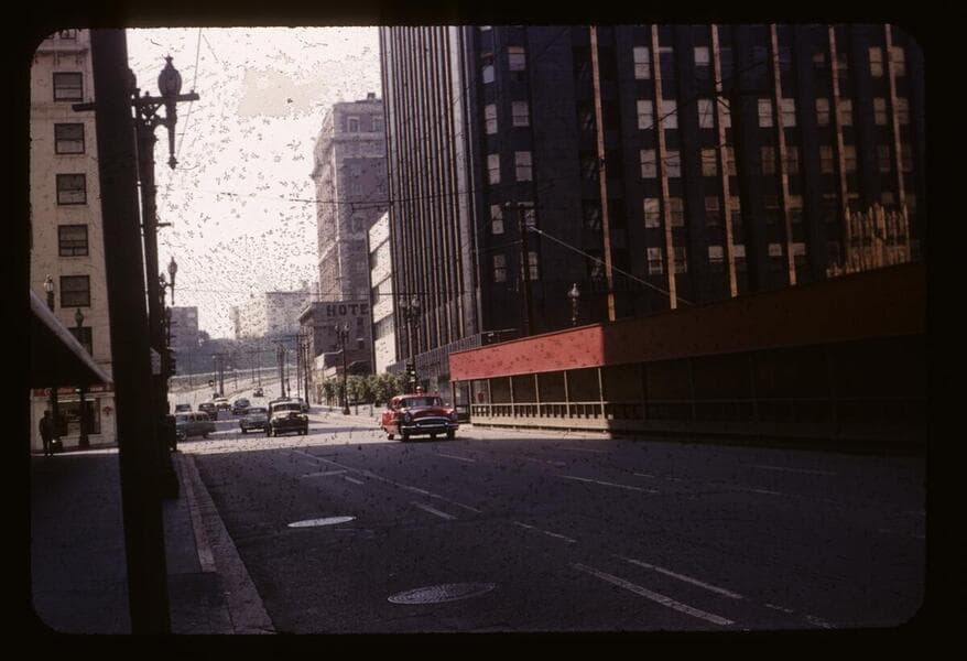 Entire north side block of 6th Street between Hope and Flower Streets to be demolished. Background building is the California Club, 538 South Flower Street.