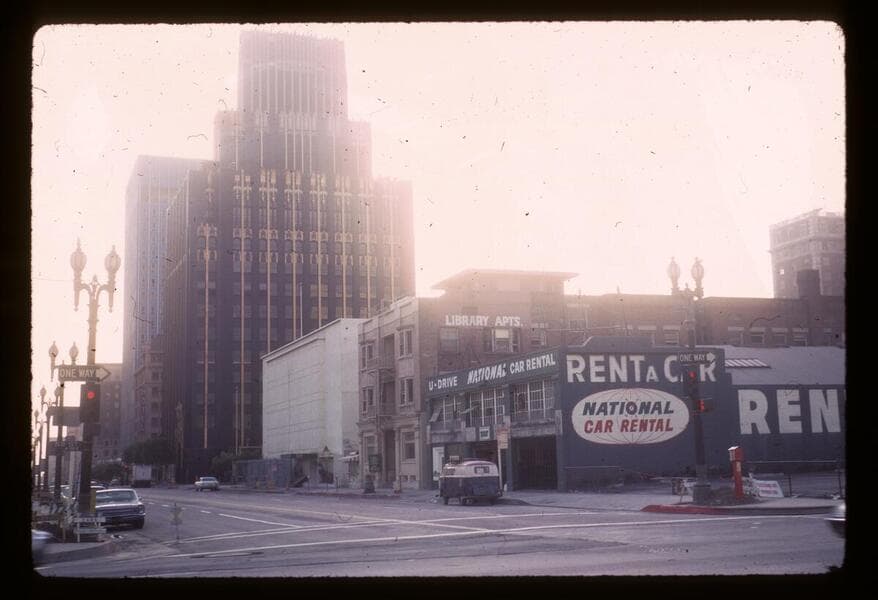 Looking southeast at the Flower and 5th Streets intersection towards Los Angeles Central Library. Steel skyscraper, 515 South Flower Street, of City National Plaza (formerly ARCO Plaza) taking form at right. Church of the Open Door, with its Jesus Saves rooftop sign, to the right of the library. Crocker Citizens Bank skyscraper towers over its neigbors.