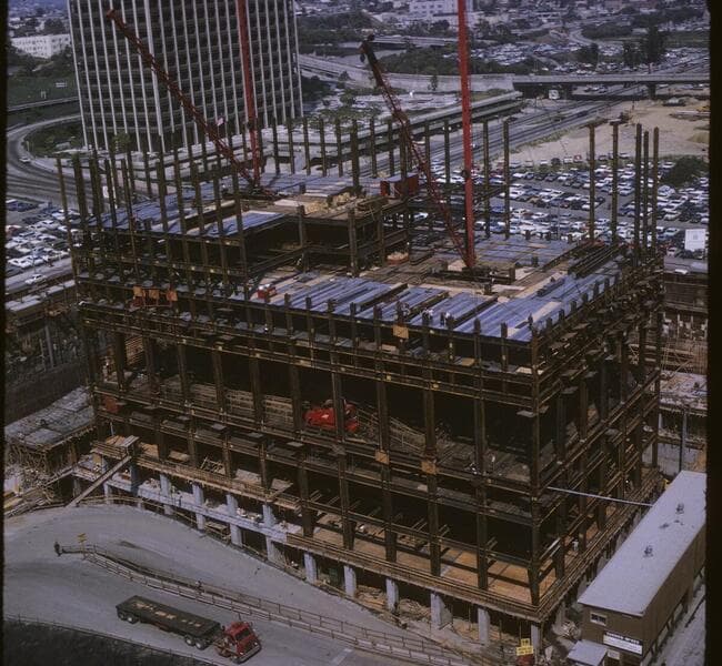 This collection consists of 35mm Kodachrome slides taken between 1954 and 1972. This collection of photographs taken by amateur photographer Palmer Conner documents by street the physical and social changes of Bunker Hill during the earliest stages of redevelopment. The collection is particularly strong in its depiction of the Bunker Hill neighborhood of downtown Los Angeles during redevelopment in the 1950s. Images chiefly consist of views of commercial and residential building exteriors taken from the street, including images of both new construction and older buildings in the process of being demolished.