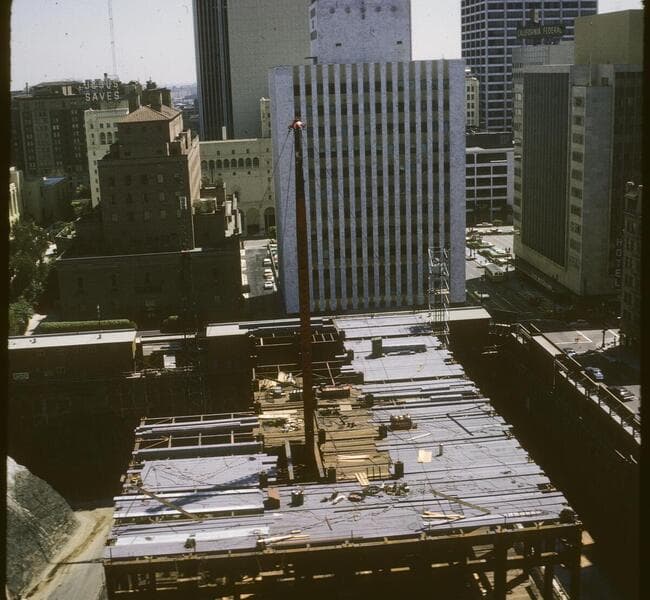 This collection consists of 35mm Kodachrome slides taken between 1954 and 1972. This collection of photographs taken by amateur photographer Palmer Conner documents by street the physical and social changes of Bunker Hill during the earliest stages of redevelopment. The collection is particularly strong in its depiction of the Bunker Hill neighborhood of downtown Los Angeles during redevelopment in the 1950s. Images chiefly consist of views of commercial and residential building exteriors taken from the street, including images of both new construction and older buildings in the process of being demolished.