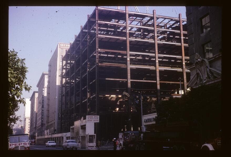 Early beginnings of the steel skeleton frame assembly for One Wilshire Building, 624 South Grand Avenue. Behind is the Security Title Insurance Building, 530 West 6th Street.
