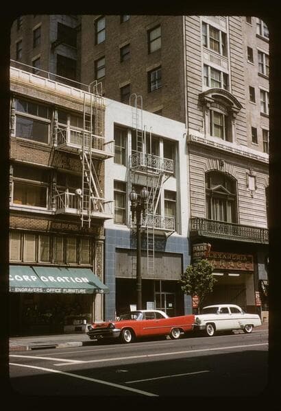 West side view of Wilcox Building and Annex on Spring Street from Broadway. Signs and billboard for California Bank visible on sides of the buildings. Cupola of the Cathedral of St. Vibiana is visible in the background to the right of the buildings.