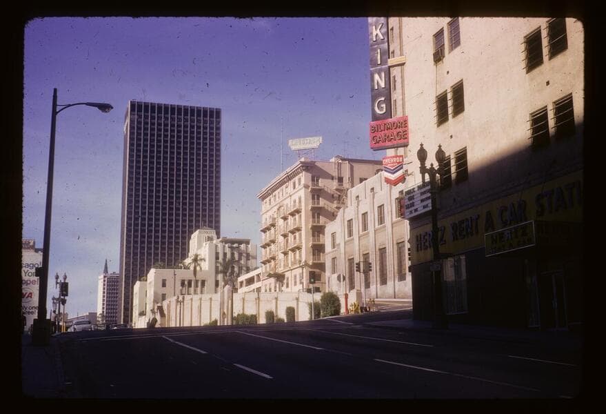 This collection consists of 35mm Kodachrome slides taken between 1954 and 1972. This collection of photographs taken by amateur photographer Palmer Conner documents by street the physical and social changes of Bunker Hill during the earliest stages of redevelopment. The collection is particularly strong in its depiction of the Bunker Hill neighborhood of downtown Los Angeles during redevelopment in the 1950s. Images chiefly consist of views of commercial and residential building exteriors taken from the street, including images of both new construction and older buildings in the process of being demolished.