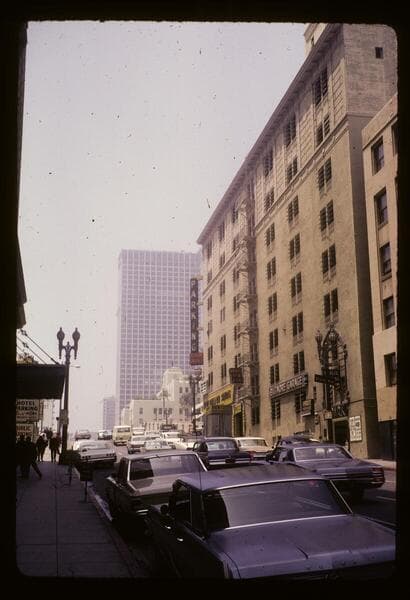 View down South Olive Street at the pedestrian scramble crossing system which allows people to cross diagonally. At right, Googies restaurant, 501 West 5th Street, and San Carlos Hotel, 507 West 5th Street. Across 5th Street is the Biltmore Hotel, 515 South Olive Street.