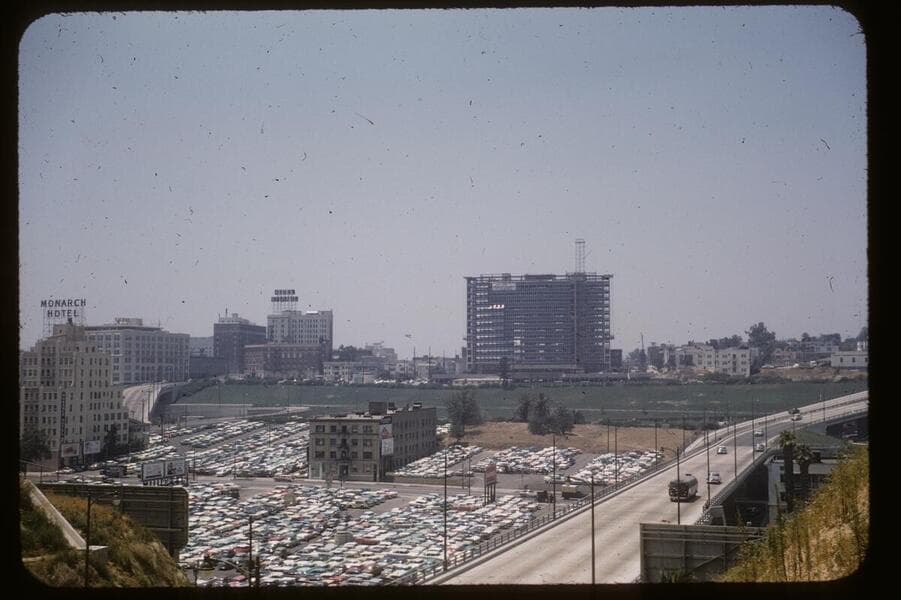 Skeleton framework for Union Oil Center nearing completion. Among the parking lots sits the Walgrove Apartments, 427 South Figueroa Street. Monarch Hotel, 905 West 5th Street, to the left has vertical and rooftop signs. Middle background building with the rooftop sign is Hotel St. Paul, 1021 West 6th Street.