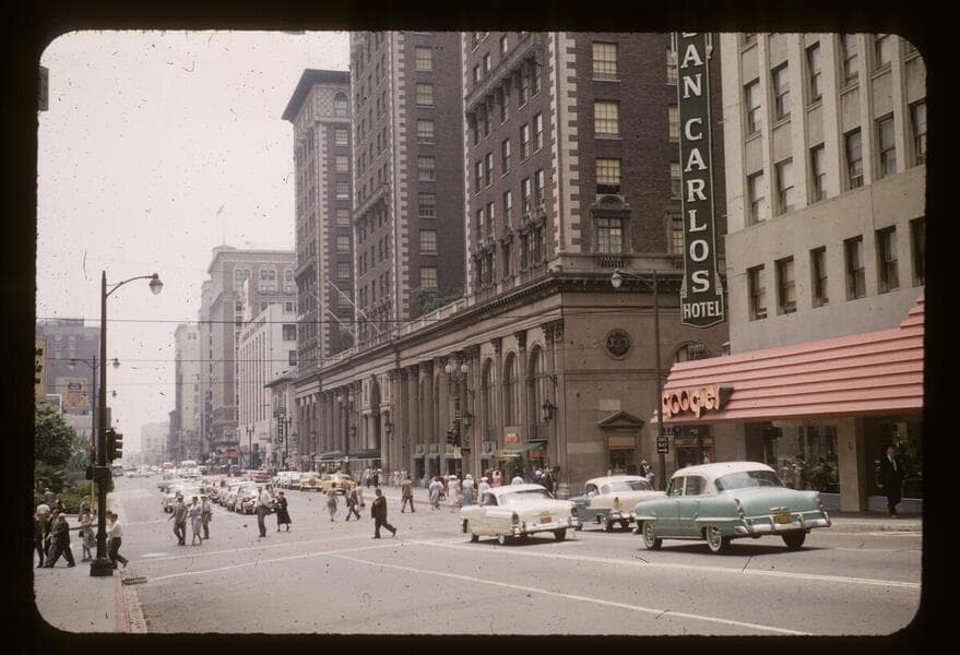 Row of four Victorian structures at 322-334 South Olive Street. In the shadowed left background is the Broadway department store and the Black Building, 357-361 South Hill Street. Visible in the far background, Hotel Clark sign is at 426 Hill Street and the tower of the Title Guarantee Building at 411 5th Street. On the sidewalk next to the cleared area is a Danger Keep Out sign and a barricade with light. 1961 Plymouth Suburban station wagon coming up the hill.