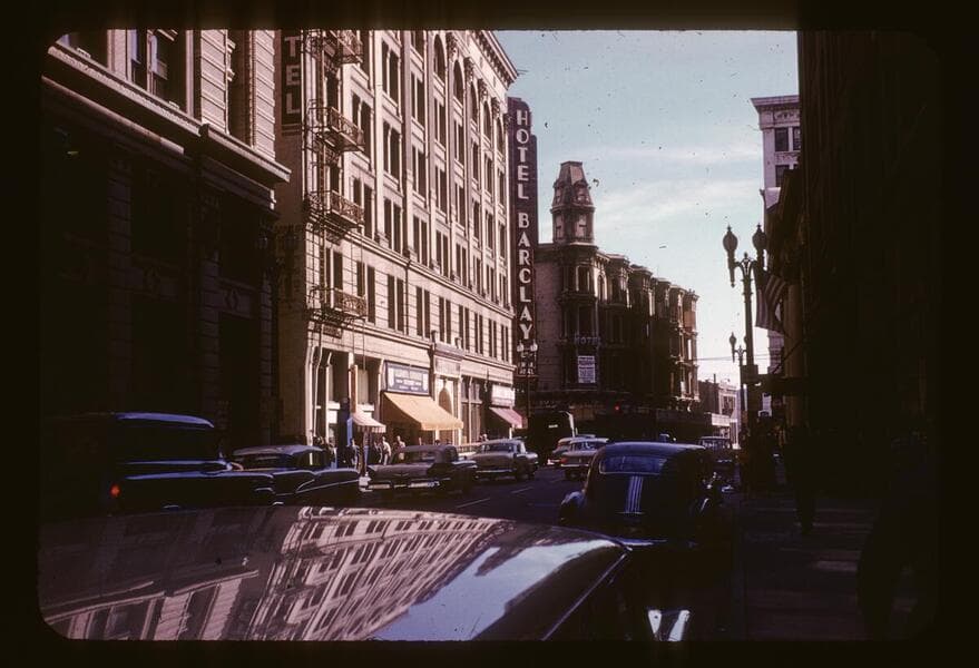 Westminster Hotel at the northeast corner of 4th Street and Main Street. The San Fernando Building is to the right.
