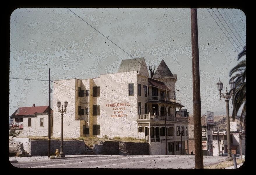 St. Angelo Hotel at 237 North Grand Avenue, near Temple Street. Turret roof at one corner and gable roof at two other corners. Billboard for Langendorf's soft white bread attached to 600 West Temple Street building.