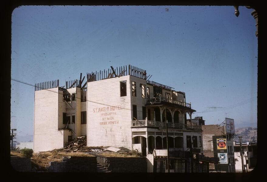 St. Angelo Hotel, 237 North Grand Avenue, reduced to rubble. Building across the street with the flagpole atop it is 601 West Temple Street.