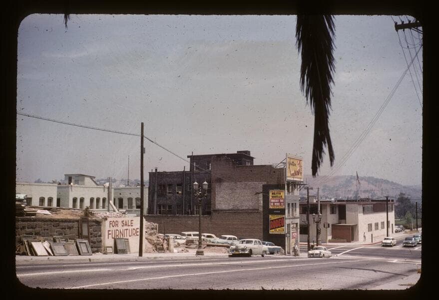 St. Angelo Hotel at 237 North Grand Avenue, near Temple Street. Turret roof at one corner and gable roof at two other corners. Billboard for Langendorf's soft white bread attached to 600 West Temple Street building.