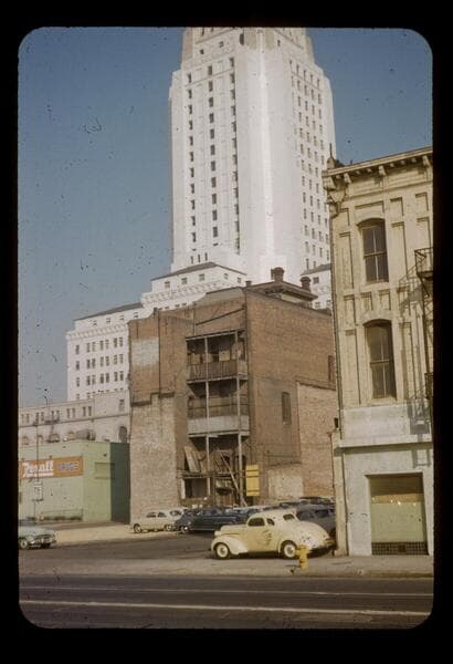 Amestoy Block, 202 North Main Street. Long, narrow rooftop fire escape ladder along building's backside. Portion of the Los Angeles City Health Building, 200 North Main Street, in right background.