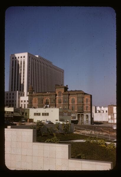 Amestoy Block, 202 North Main Street. Long, narrow rooftop fire escape ladder along building's backside. Portion of the Los Angeles City Health Building, 200 North Main Street, in right background.